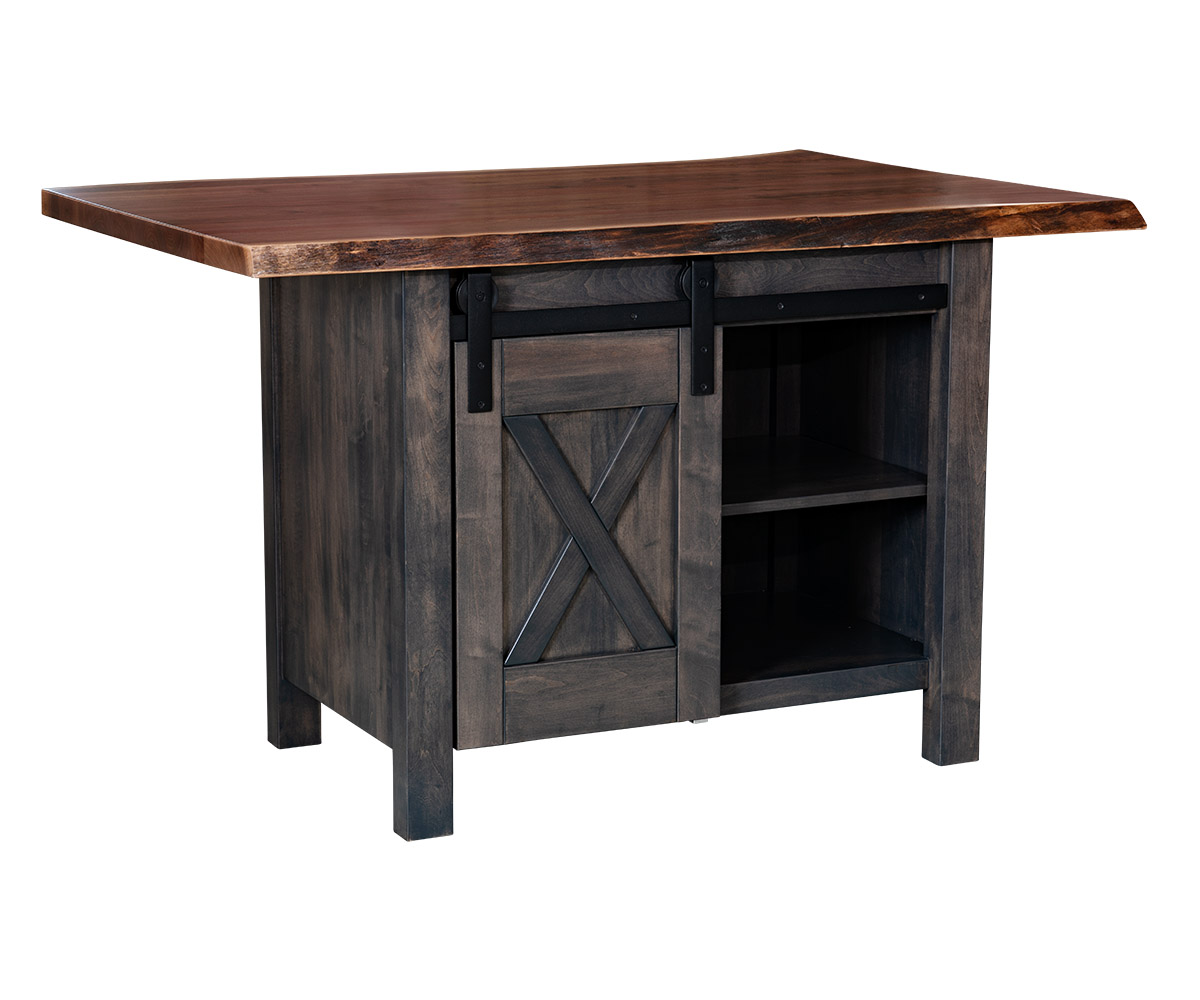 Features: • Live edge top • Sliding barn door • Two adjustable shelves, one per side